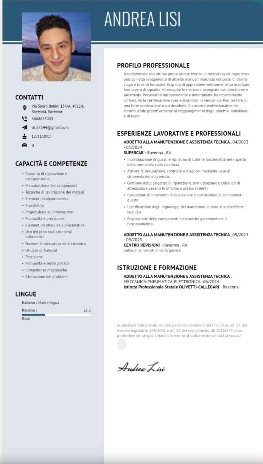 Neodiplomato con ottima preparazione teorica in meccanica ed esperienza pratica nello svolgimento di attività manual maturata nel corso di diversi sta... View More